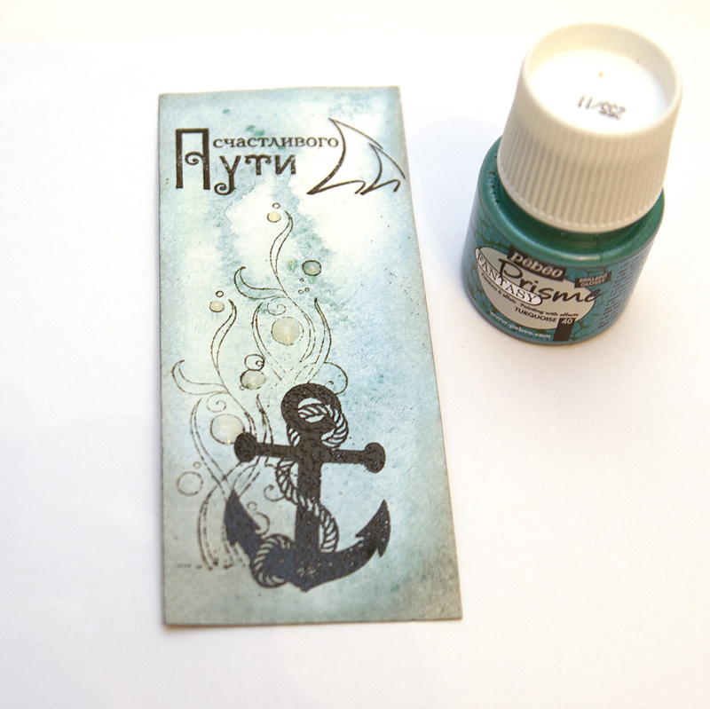Видите, рядом с закладкой баночка с очередной необычной краской? С ее помощью я решила создать дополнительный эффект, напоминающий морскую поверхность. Эту краску необходимо просто налить в нужное место такой лужицей